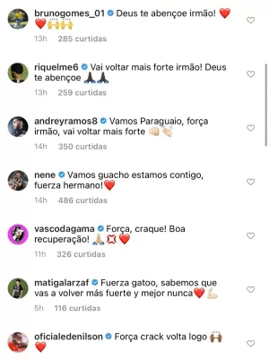 Outros que mandaram mensagens de apoio foram seus ex-companheiros de Internacional, Patrick e Edenílson. O volante da Seleção Brasileira escreveu: "Força, craque! Volta logo!".