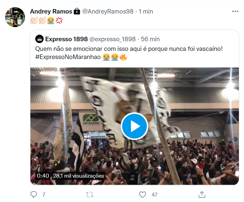 Andrey 'chora' no Twitter com vídeos da recepção da torcida ao Vasco no Maranhão