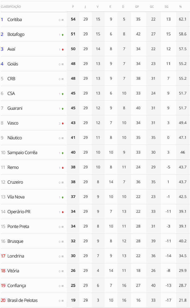 Terminada a 29ª rodada do Brasileiro da Série B, o Vasco, que perdeu para o Sampaio Correa por 1 a 0, está na 8ª colocação (caindo duas em relação ao fim da 28ª rodada) e a 5 pontos do G4 (sem variação em relação ao fim da rodada anterior).