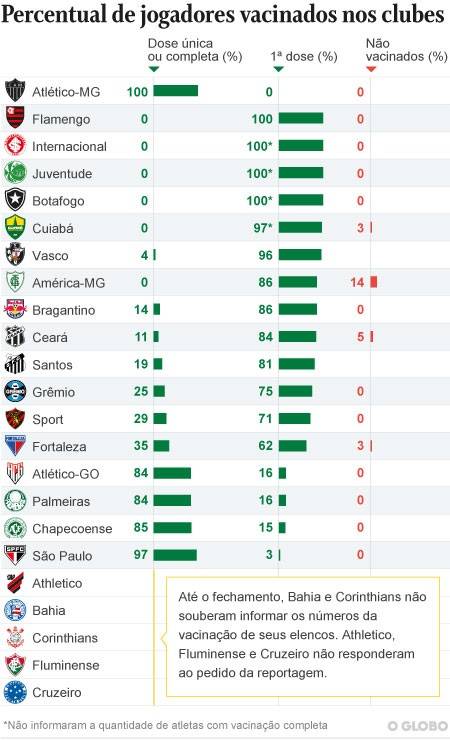 Dos clubes que atenderam à reportagem do GLOBO, apenas Sport e Juventude afirmaram que trataram a vacinação como algo obrigatório para seus jogadores. Alguns clubes disseram que orientaram seus atletas da importância da vacinação, mas que a adesão ao imunizante foi espontânea.
