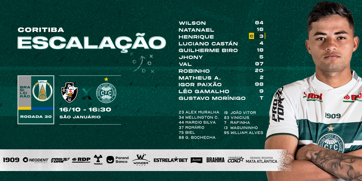 Veja a escalação do Coritiba para o jogo contra o Vasco