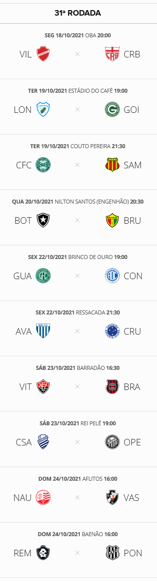 A 31ª rodada do Brasileiro da Série B se inicia nesta 2ª-feira com um jogo que interessa ao Vasco: Vila Nova x CRB, às 20h, em Goiânia. Uma derrota do CRB, 5º colocado e a 1 ponto do G4, é boa para o Vasco, que está em 6º lugar e a 4 pontos do G4. O Gigante da Colina fecha a 31ª rodada no domingo, às 16h, contra o Náutico, em Recife.