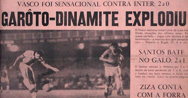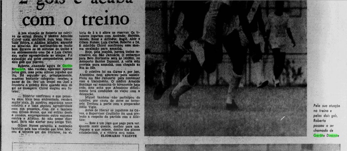 Em matéria assinada por Eliomario Valente, estava lá: 'Roberto, agora chamado de 'Garoto Dinamite', não recebeu aplausos apenas pelos gols, mas pelas ótimas jogadas que fez'.