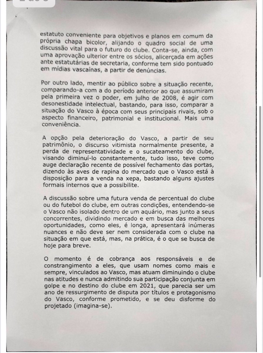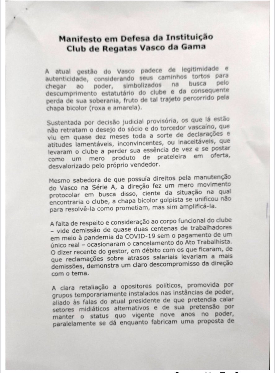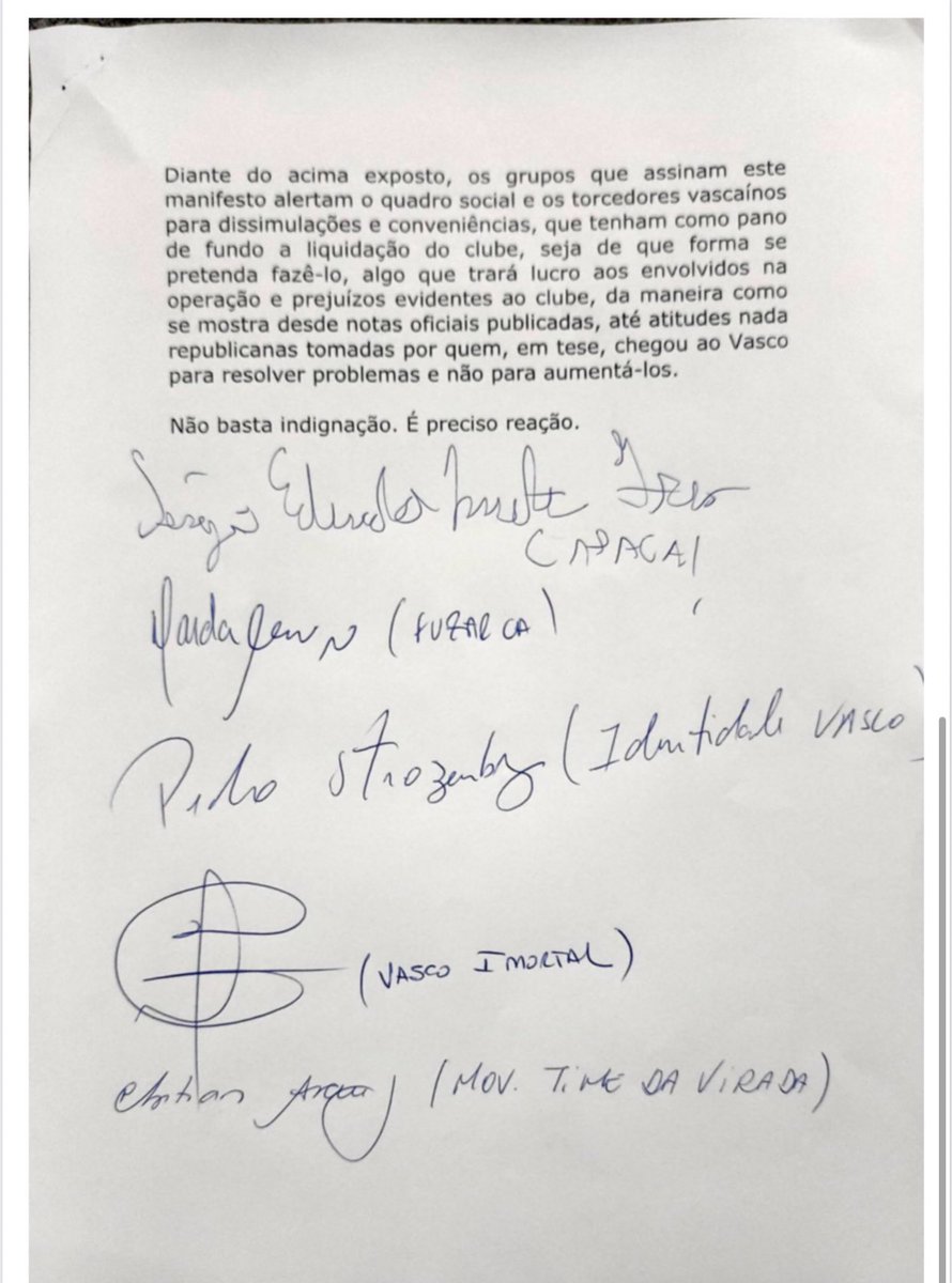 Grupos Casaca, Fuzarca, Identidade Vasco, Time da Virada e Vasco Imortal emitiram um "Manifesto em Defesa da Instituição Club de Regatas Vasco da Gama"