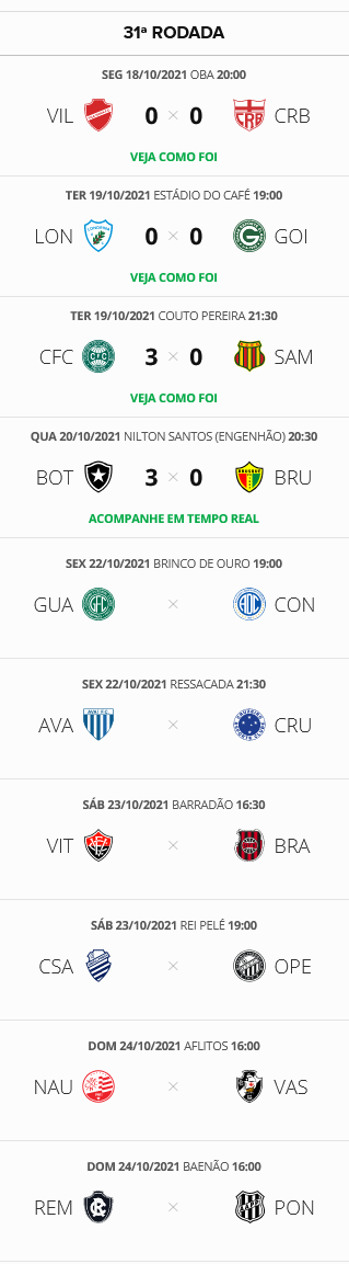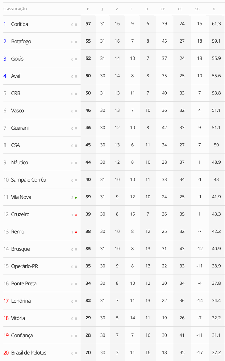 No único jogo desta 4ª-feira pela 31ª rodada do Brasileiro da Série B, o Botafogo derrotou o Brusque por 3 a 0, resultado que não foi bom para o Vasco, pois o rival carioca está no G4. O Gigante da Colina, que está em 6º lugar e a 4 pontos do G4, joga no domingo, às 16h, contra o Náutico, em Recife.