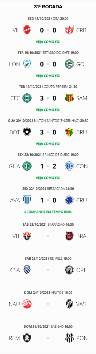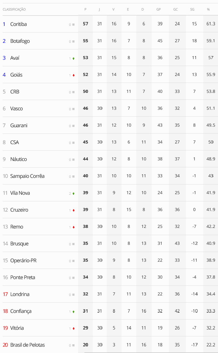 A 31ª rodada do Brasileiro da Série B teve seguimento nesta 6ª-feira com 2 jogos. O Confiança venceu o Guarani por 2 a 1 e impediu que o time paulista ultrapassasse o Vasco. Já o Avaí venceu o Cruzeiro por 1 a 0, subiu para a 3ª colocação e abriu 7 pontos em relação ao Gigante da Colina, que agora está a 6 pontos do G4, mas reduzirá a diferença para 3 pontos caso vença o Náutico neste domingo às 16h em Recife.