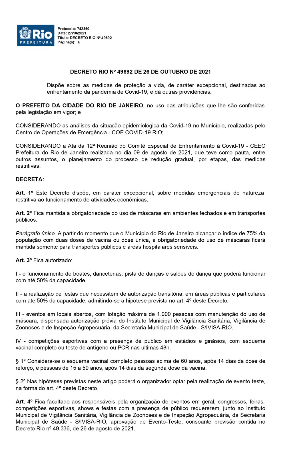 A Prefeitura do Rio de Janeiro publicou nesta quarta-feira decreto sem restrição de público em estádios ou outras sedes de competições esportivas. A posição flexibiliza as últimas exigências feitas pelo poder público, que liberava até 50% da capacidade dos locais dos eventos.