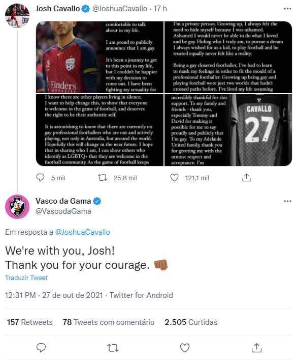 Vasco publica mensagem de apoio ao jogador Josh Cavallo, que revelou ser gay