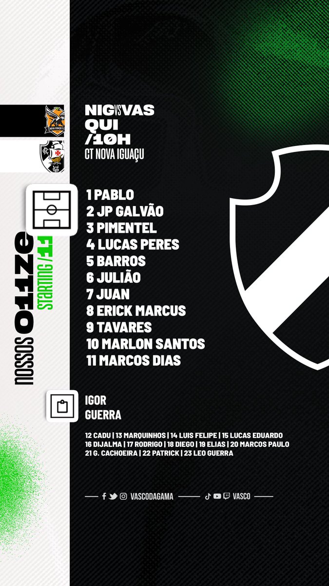 26/10/21 - Juniores: Confira a escalação do Vasco para o jogo contra o Urubu