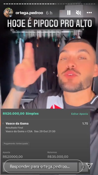 Alguém acredita mais na vitória do Vasco contra o CSA que o influencer Pedro Ortega? Ex-participante do programa "De Férias com Ex", da MTV, o empresário vascaíno resolveu apostar R$ 20 mil na vitória do Cruz-maltino nesta rodada. Através de sua conta oficial do Instagram, Ortega publicou o seu investimento.