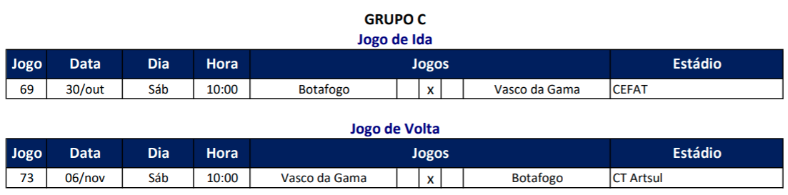 No 1º jogo das quartas de final do Estadual Sub-17, o Vasco visita o Botafogo neste sábado às 10h no Cefat. O jogo de volta será no outro sábado, dia 06/11, às 10h, no Nivaldo Pereira.