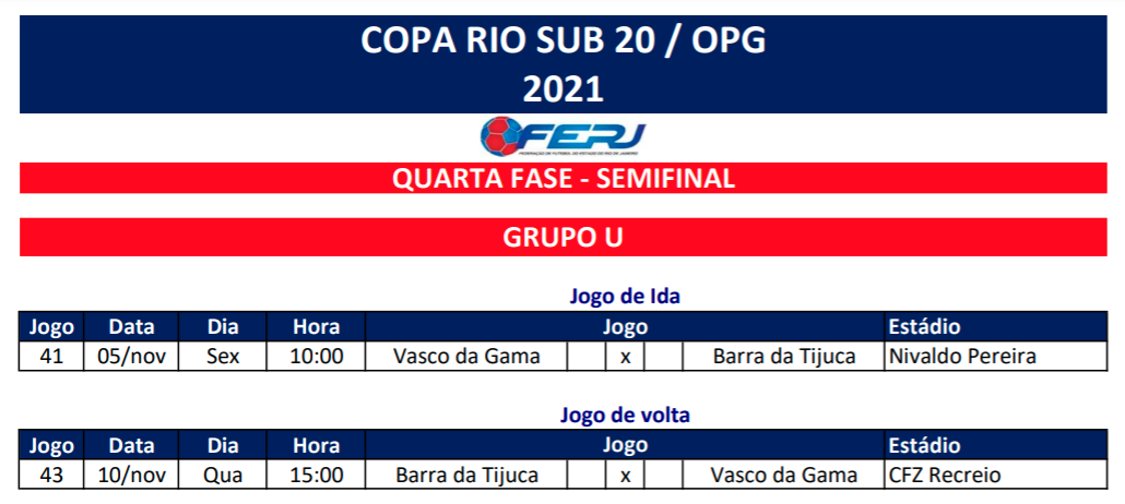 O jogo Vasco x Barra da Tijuca, partida de ida da semifinal da Copa Rio Sub-20/Torneio OPG, que seria na 4ª-feira, foi adiado para 6ª-feira às 10h.