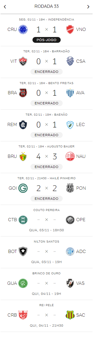 A 33ª rodada do Brasileiro da Série B teve 5 jogos nesta 3ª-feira. Os resultados não mudaram a posição do Vasco na classificação. O Gigante da Colina segue em 8º lugar, mas a distância para o G4 aumentou para 7 pontos. O Vasco irá a campo na 5ª-feira, às 19h, contra o Guarani, em Campinas.