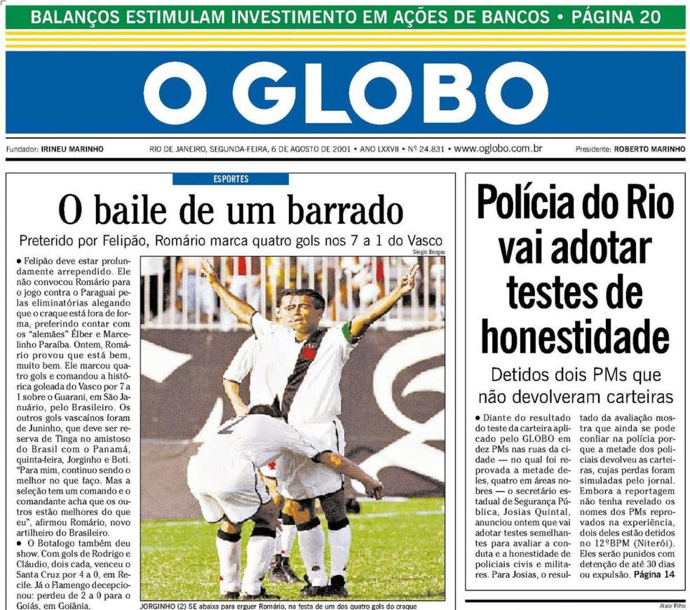 A maior goleada do confronto foi conquistada há 20 anos: o Vasco fez 7 a 1 em show de Romário, que iniciava uma queda de braço com Luiz Felipe Scolari, então técnico da Seleção.
