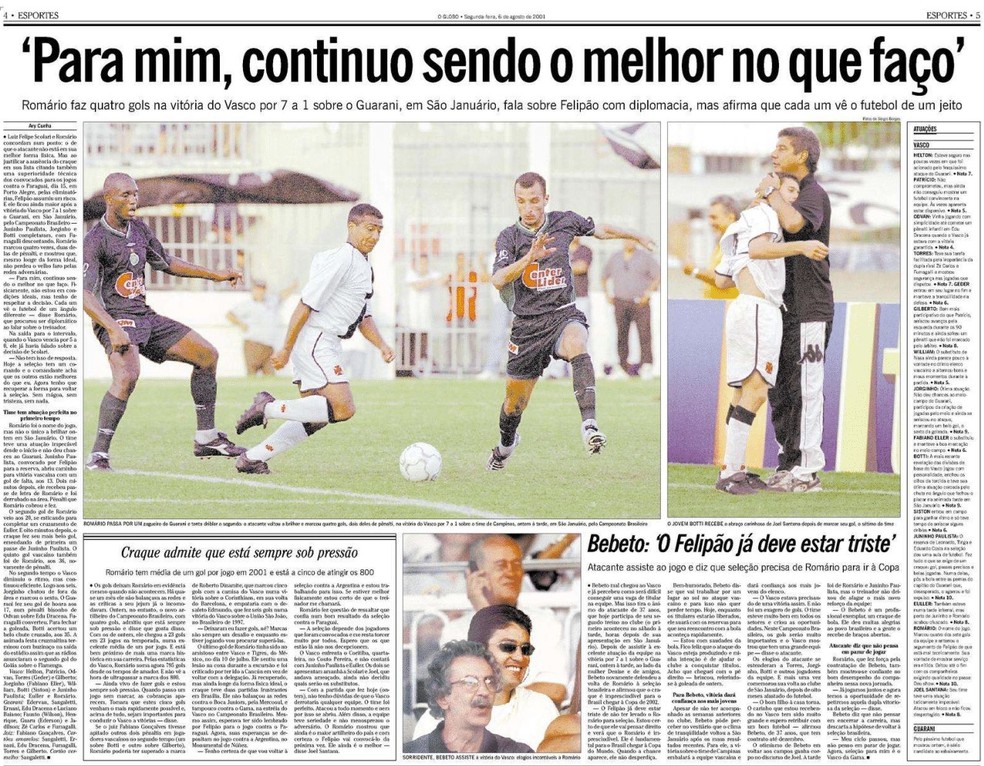 Romário ainda estava longe dos 1002 gols com os quais encerrou a carreira em 2007, mas se aproximava da marca dos 800. Com os quatro gols contra o Guarani, chegava a 795.