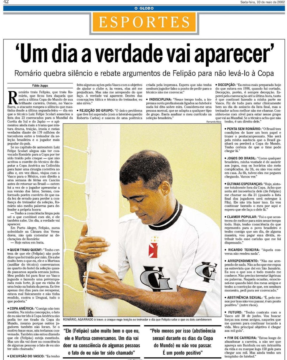 Em 6 de maio de 2002, quando anunciou os convocados sem Romário, Felipão confirmou que o pedido do Baixinho para não jogar a Copa América teve influência na lista final.