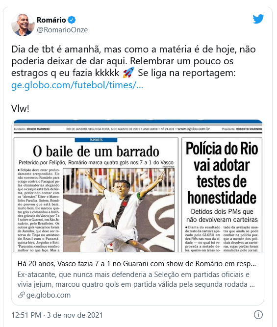 07/10/21 - Romário publica indireta para Edmundo em #TBT no Twitter; veja