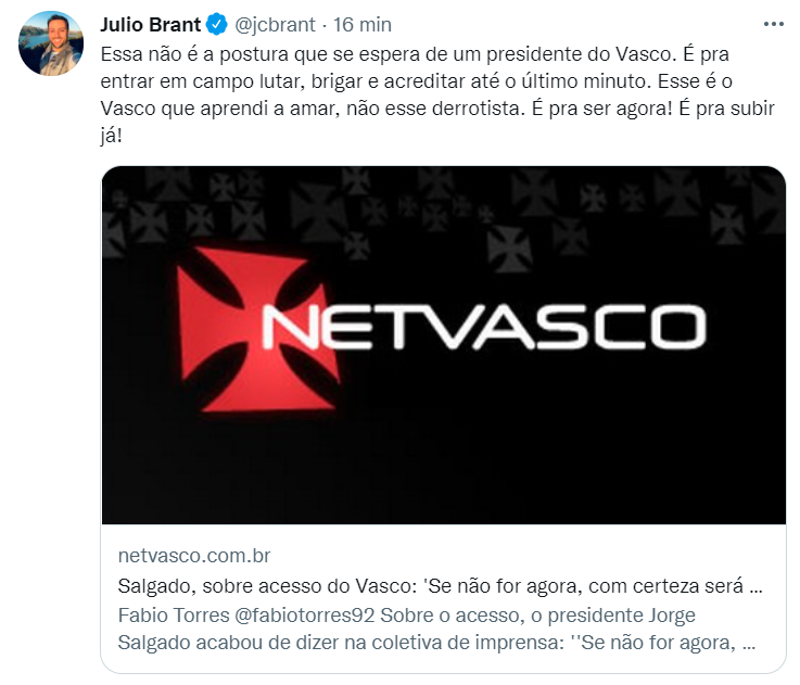 Essa não é a postura que se espera de um presidente do Vasco. É pra entrar em campo lutar, brigar e acreditar até o último minuto. Esse é o Vasco que aprendi a amar, não esse derrotista. É pra ser agora! É pra subir já!