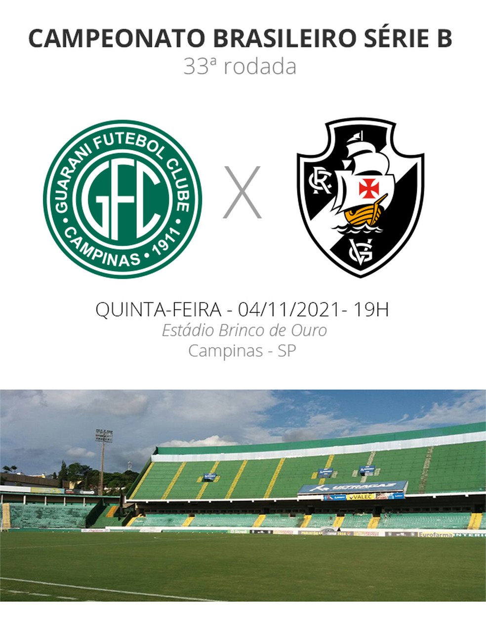 Em jogo de times que ainda sonham com acesso para a Série A, Guarani e Vasco se enfrentam nesta quinta, às 19h, no Bruno de Ouro, em Campinas. A partida é válida pela 33ª rodada da Série B. CLIQUE AQUI para acompanhar o Tempo Real!