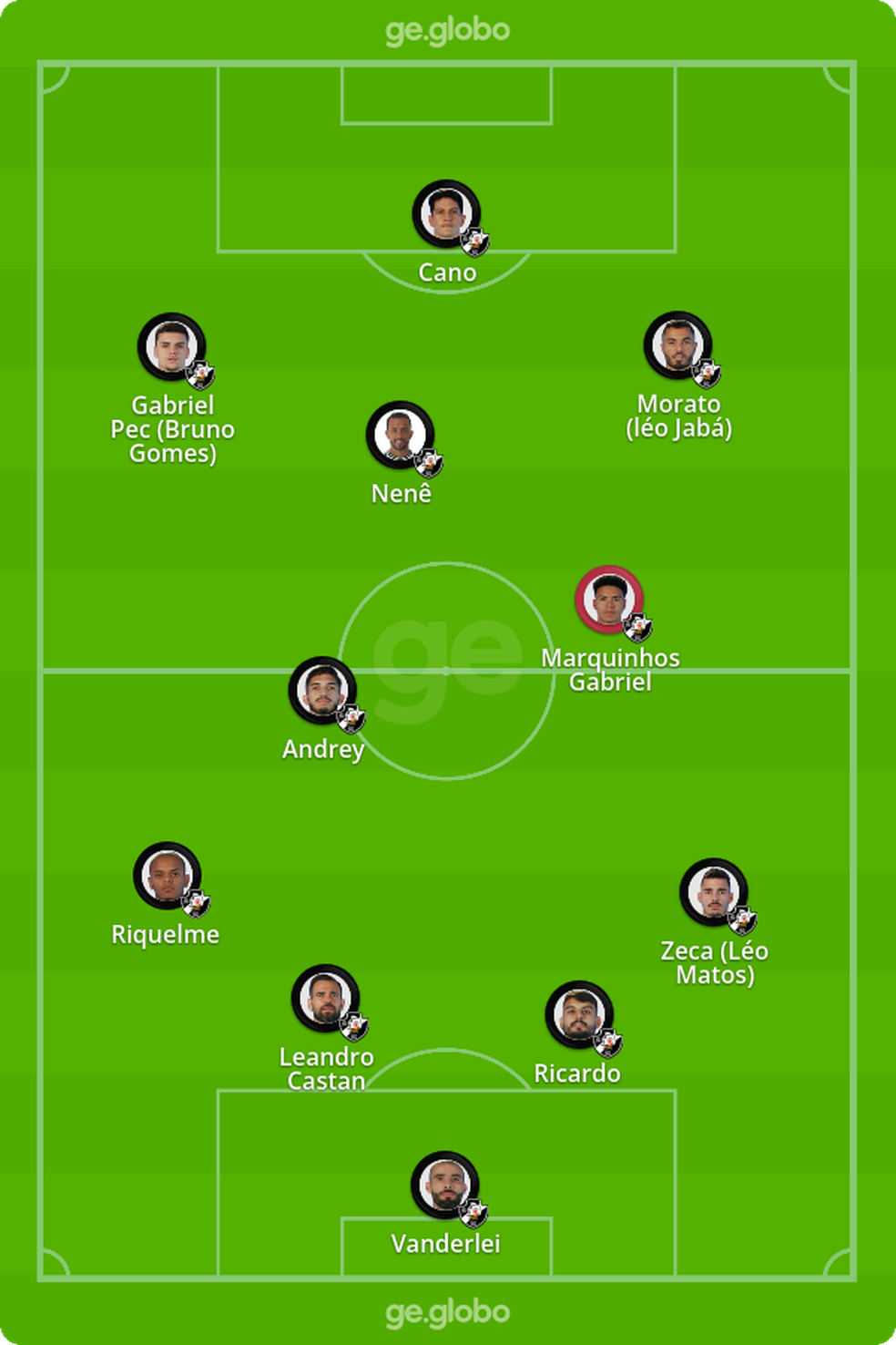 A principal notícia no Vasco é a volta de Nenê. Após cumprir suspensão, o meia retorna ao time, nesta quinta, contra o Guarani. A tendência é que Bruno Gomes seja sacado, mas Fernando Diniz também pode optar por tirar um dos atacantes do time, uma vez que Morato e Gabriel Pec não passam por um bom momento. Outra dúvida é na lateral. Zeca vem de atuações ruins e pode perder espaço para Léo Matos, antigo dono da posição.