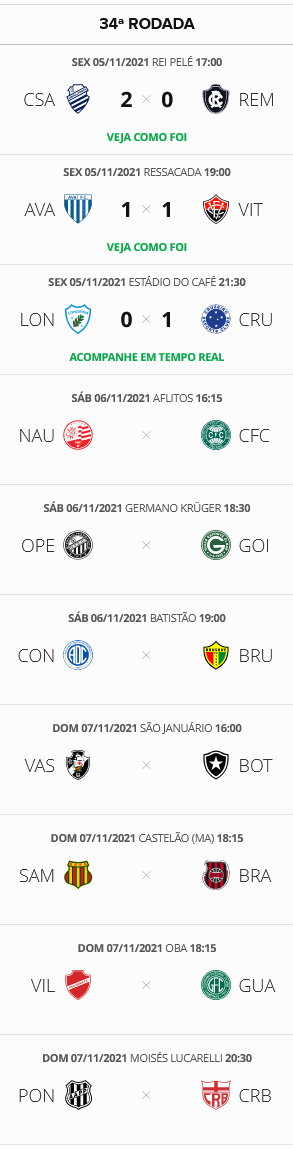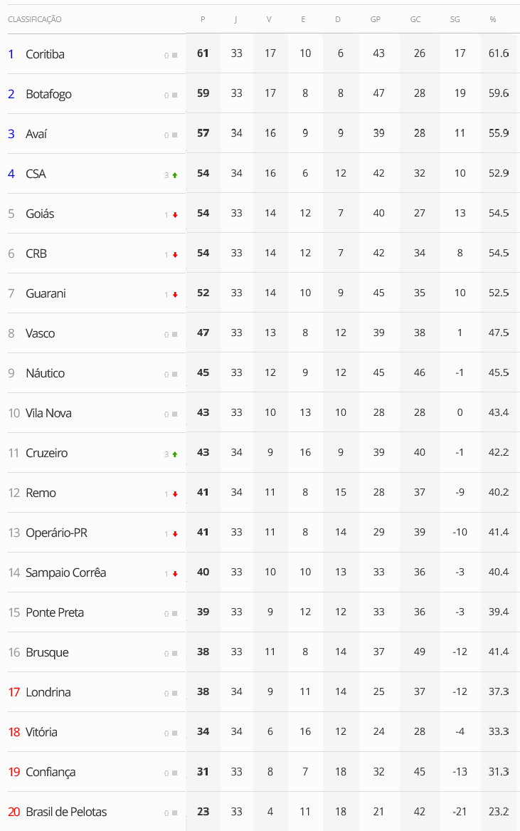 A 34ª rodada do Brasileiro da Série B se iniciou nesta 6ª-feira com 3 jogos. CSA e Avaí pontuaram e se distanciaram do Vasco, que segue em 8º lugar e a 7 pontos do G4. O Gigante da Colina vai a campo no domingo, às 16h, em São Januário, contra o Botafogo.