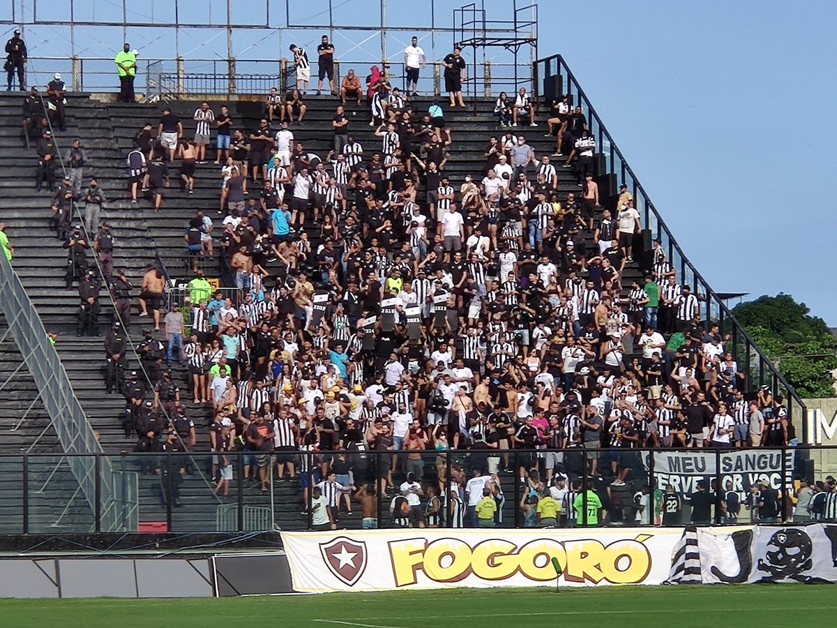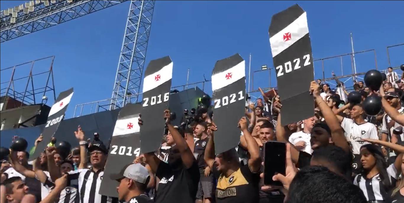 Torcida do Botafogo leva cinco caixões com o desenho da cruz de malta. Em cada um deles, o ano em que o Vasco esteve na Série B, incluindo já 2022.
