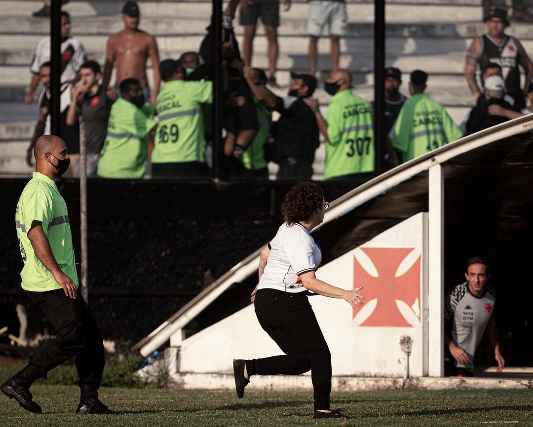 Começou cedo, a confusão em São Januário. Bombas estouram no lado de fora; dentro dele, uma mulher invade o gramado e corre na direção do vestiário. Correria no setor atrás do gol, com polícia e seguranças agindo com violência. Já vimos esse vídeo antes. Triste.