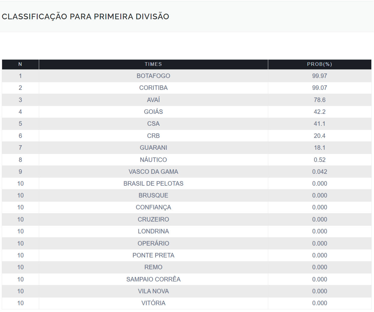 Probabilidades no Futebol, da UFMG, diz que Vasco tem 0,042% de chance subir para a Série A