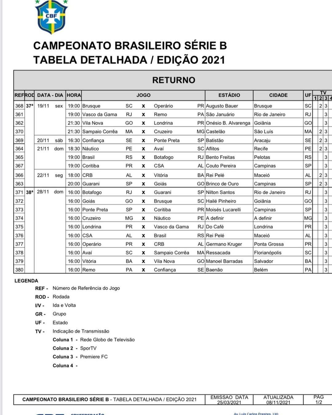 CBF detalha as rodadas 37 e 38 do Brasileiro da Série B