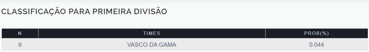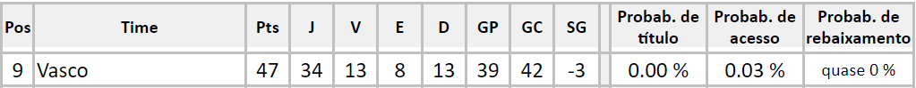 O Vasco ainda tem chances matemáticas de subir para a Série A, mas elas são irrisórias. O site Infobola informa 0% de probabilidade porque arredonda seus índices. Outros sites, como o Chance de Gol e o Probabilidades no Futebol/UFMG, que trabalham com casas decimais, dão valores diferentes de zero, embora muito pequenos. Veja abaixo.