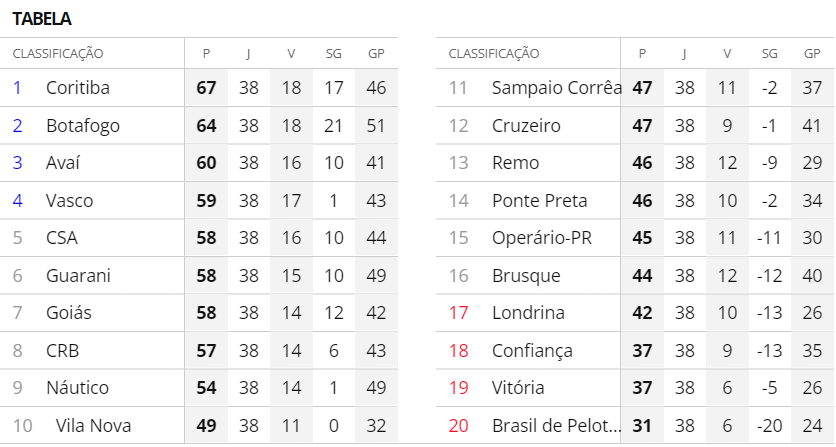 - O Vasco (9º colocado, 47 pontos) vence seus 4 jogos restantes (Vitória, Vila Nova, Remo e Londrina), chegando a 59 pontos