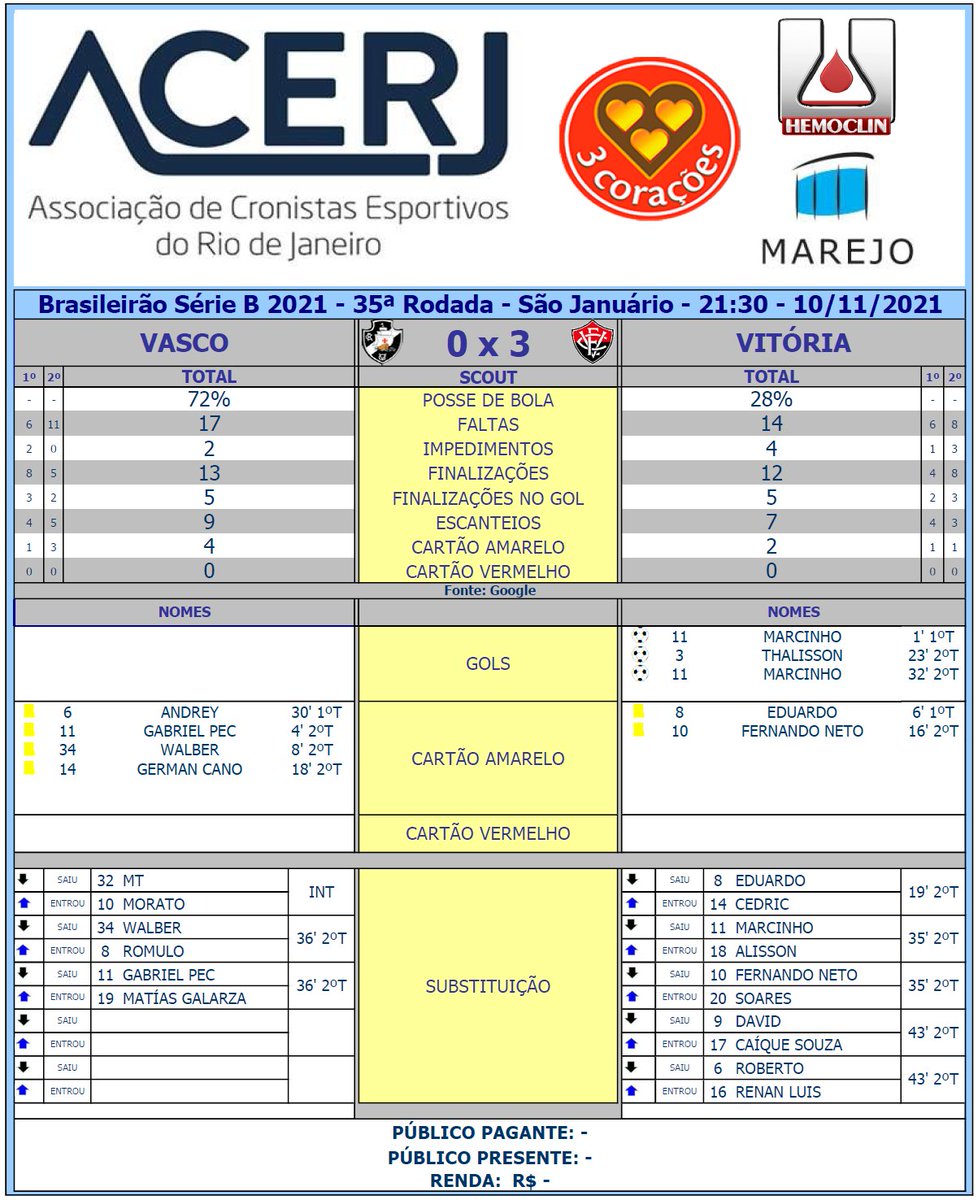 Cartões amarelos: Andrey, Gabriel Pec, Germán Cano e Walber (Vasco); Eduardo e Fernando Neto (Vitória)