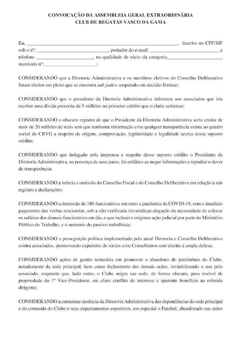 Na madrugada de quinta-feira, um formulário online foi divulgado. Os líderes do manifesto têm o objetivo de alcançar de 2.500 a 3.000 assinaturas até janeiro. Os grupos políticos Identidade Vasco, Fuzarca, Time da Virada e Imortal são os responsáveis pela confecção e distribuição do documento. Há a expectativa de adesão por parte de Leven Siano e da Sempre Vasco, liderada por Julio Brant. Estes, porém, ainda não se posicionaram. O Casaca! optou por não assinar a nota.