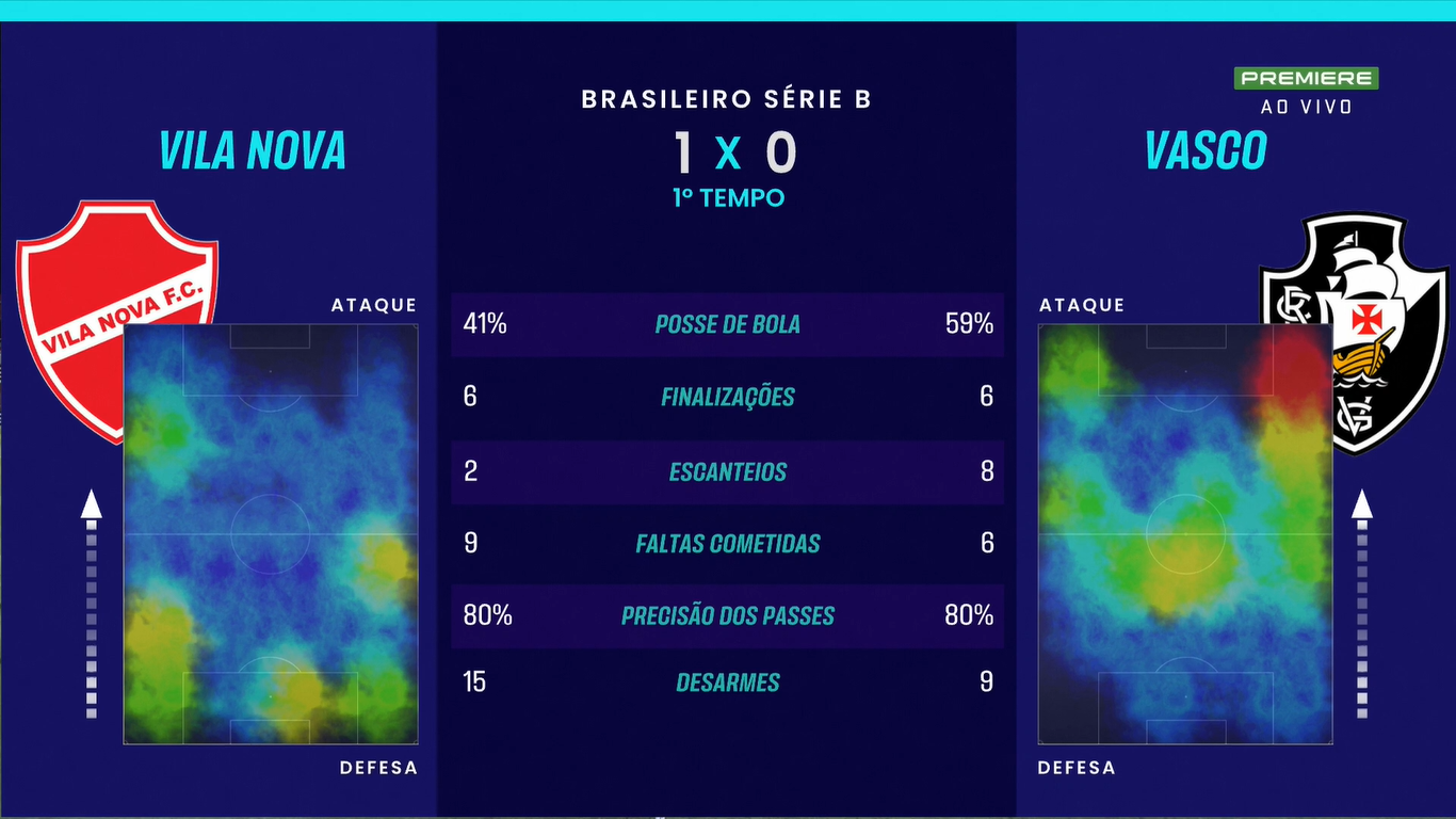 Veja o mapa de calor do 1º tempo de Vila Nova x Vasco