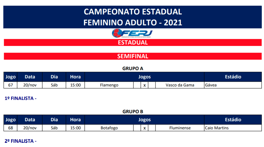 A FFERJ já detalhou a tabela das semifinais do Campeonato Estadual Feminino. O Vasco enfrentará o Flamengo no sábado, às 15h, na Gávea, em jogo único e sem vantagem do empate. A outra semifinal terá o Botafogo recebendo o Fluminense nos mesmos dia e horário.