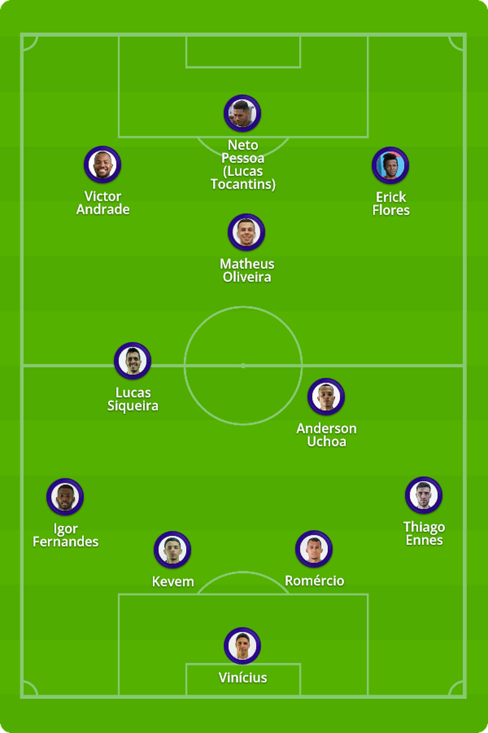 Provável escalação: Vinícius; Thiago Ennes, Romércio, Kevem e Igor Fernandes; Anderson Uchôa, Lucas Siqueira e Matheus Oliveira; Erick Flores, Victor Andrade e Neto Pessoa (Lucas Tocantins).
