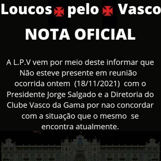 A LPV vem por meio deste informar que Não esteve presente em reunião ocorrida ontem (18/11/2021) com o Presidente Jorge Salgado e a Diretoria do Clube Vasco da Gama por nao concordar com a situação que o mesmo se encontra atualmente.