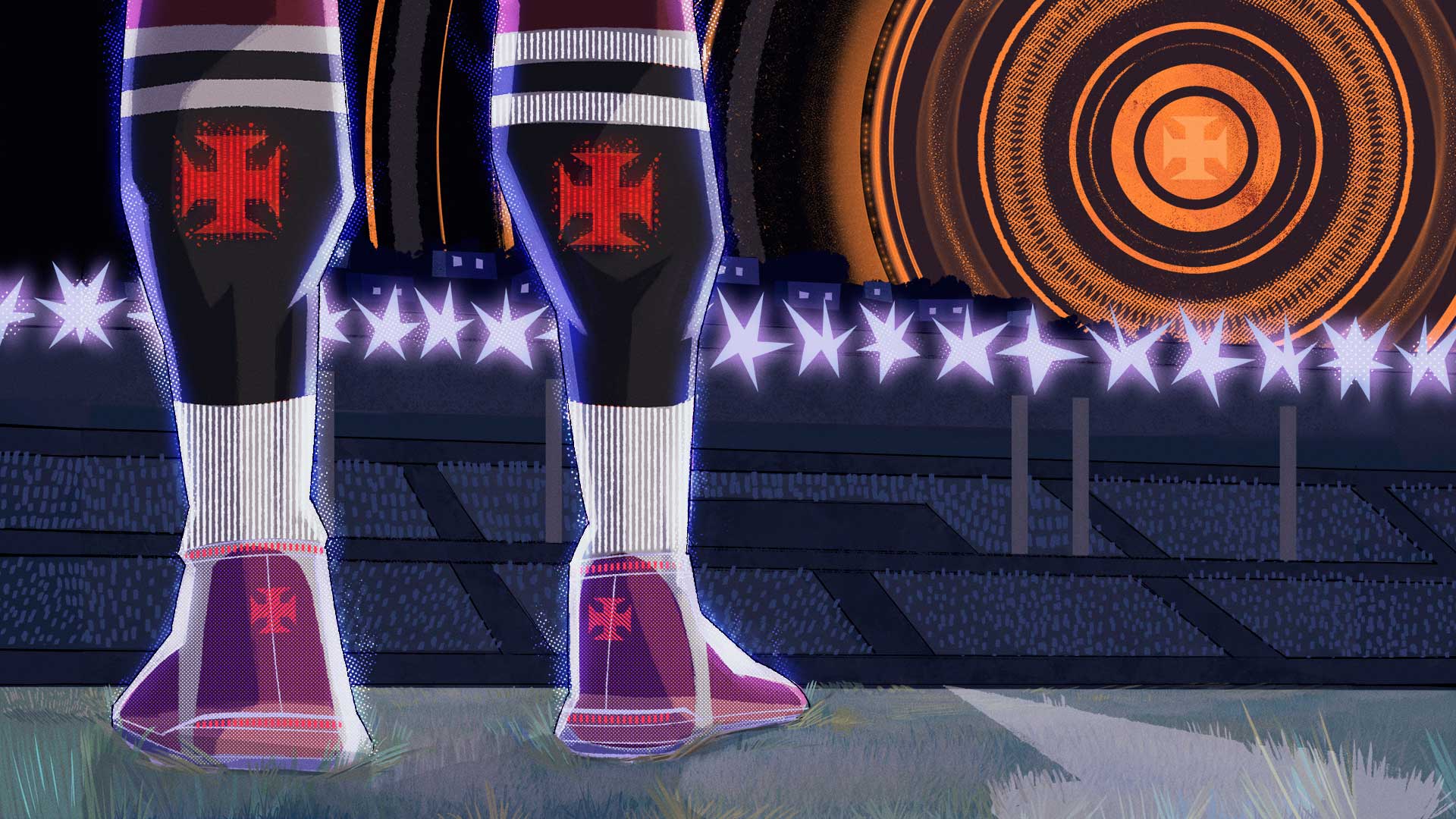 Pés sobre um gramado, em perspectiva, deixando marcas no chão. Chuteiras/meiões com a cruz de malta, diáfanos, cuja transparência pode revelar os pés negros escrevendo a história. O céu sobre o gramado está repleto de astros e ícones cósmicos de uma estética futurista.