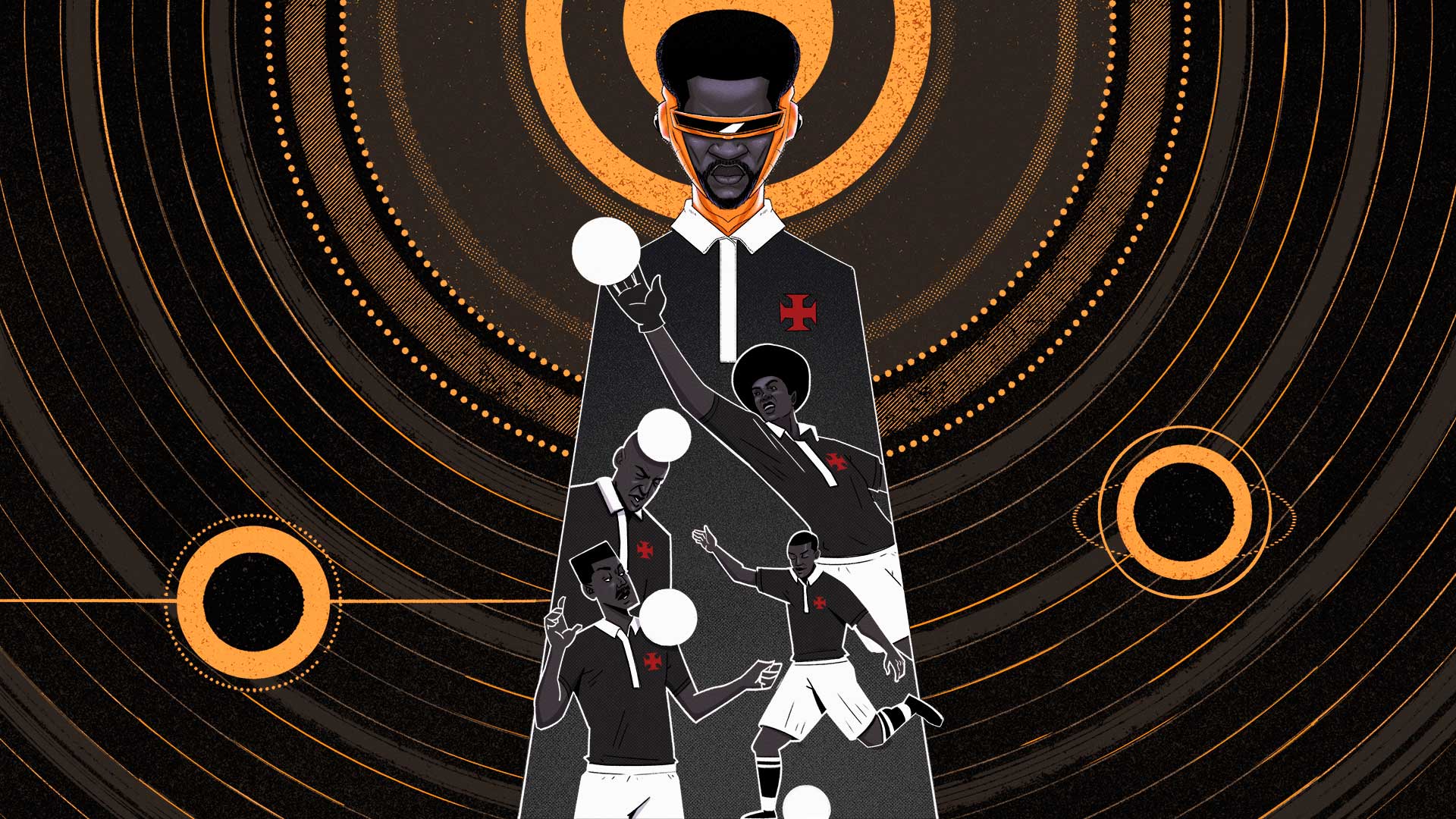 Quatro corpos negros espectrais vestidos com a camisa do Vasco, como que escaneados por uma visor de infravermelho em silhuetas etéreas, representam os quatro campos de atuação do futebol: o goleiro, o zagueiro (defensor), o meio-campo (criador) e o atacante (homem-gol). Quatro corpos sobrepostos, quatro almas para um só corpo!