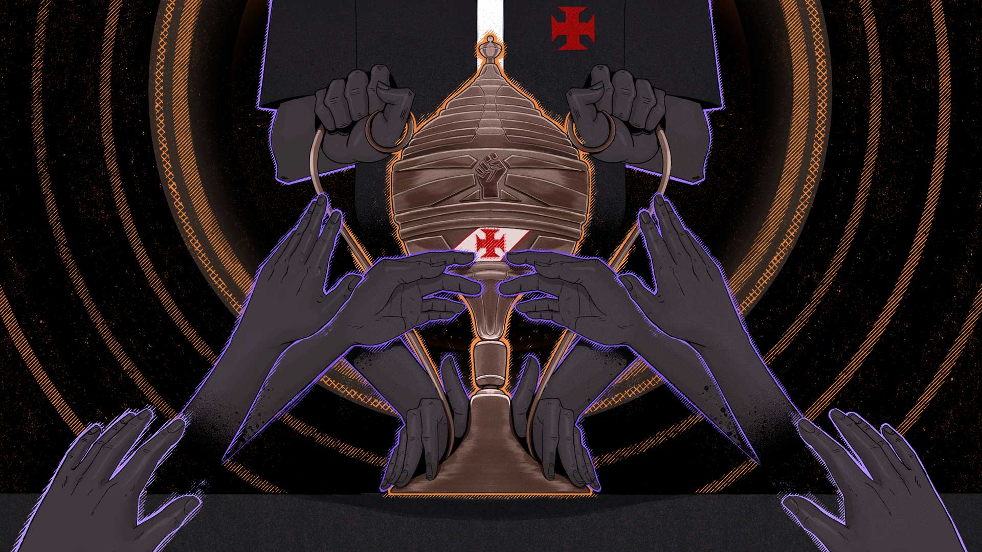 Templários do Futuro: representação da fusão entre os descendentes portugueses da fundação do clube e a população negra dos subúrbios onde o Vasco concentrava sua torcida e associados. A camisa negra do Vasco torna-se a armadura de um cavaleiro templário de corpo negro, mesclando a camisa do Vasco, o traje templário original e elementos cósmico-siderais da estética afrofuturista.