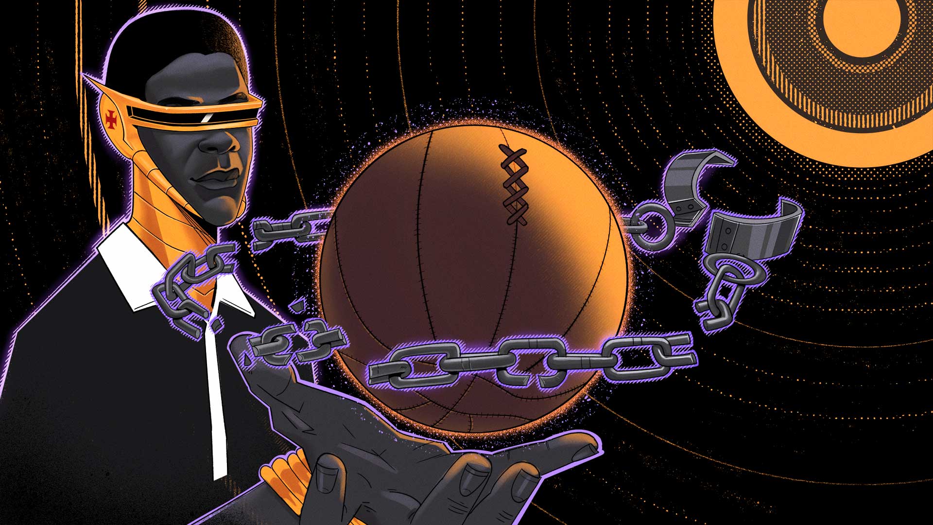 A bola de futebol como um planeta Saturno que explode seus anéis em forma de grilhões, circunscrita em uma verdadeira galáxia de cores, luzes e bolas de fogo, representando os terrores do universo que afligiram a liberdade e a autonomia dos corpos negros em busca de afirmação.