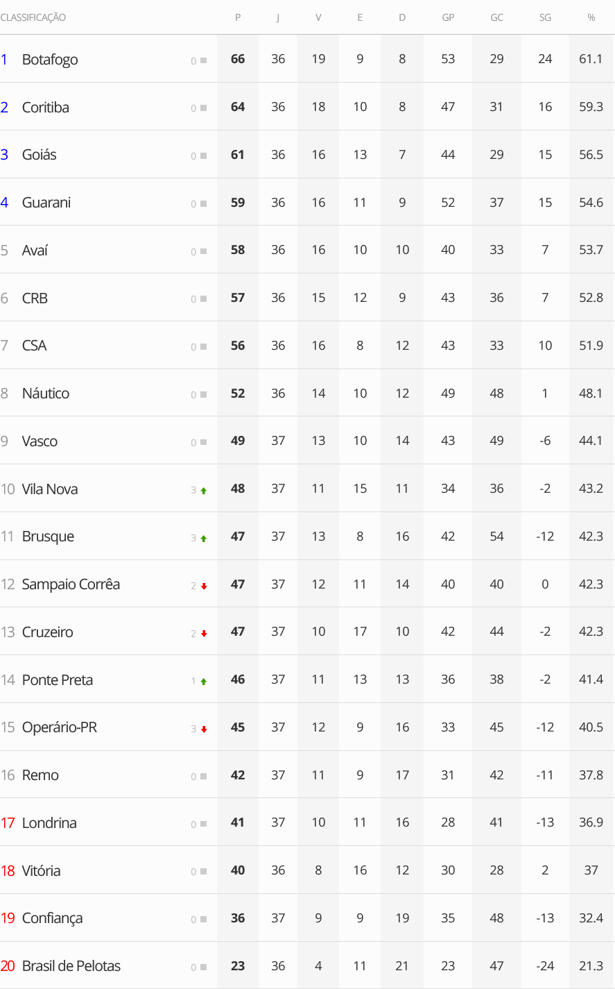 Já sem chance de acesso à Série A e também livre do rebaixamento à Série C, o Vasco, que empatou com Remo por 2 a 2, segue em 9º lugar no Brasileiro da Série B. O Gigante da Colina terminará a 37ª e penúltima rodada da competição nesta posição independentemente dos resultados dos 5 jogos que faltam para o fim da rodada.
