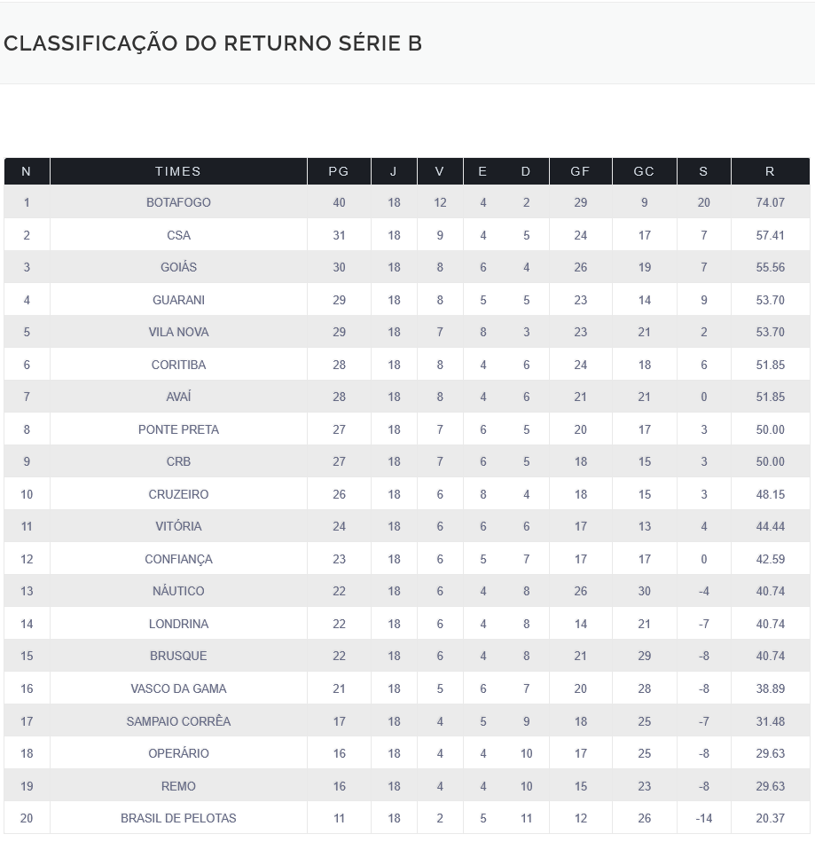 A uma rodada do fim do Campeonato Brasileiro da Série B, o Vasco é o 16º colocado no returno da competição. A campanha: 5 vitórias, 6 empates e 7 derrotas.