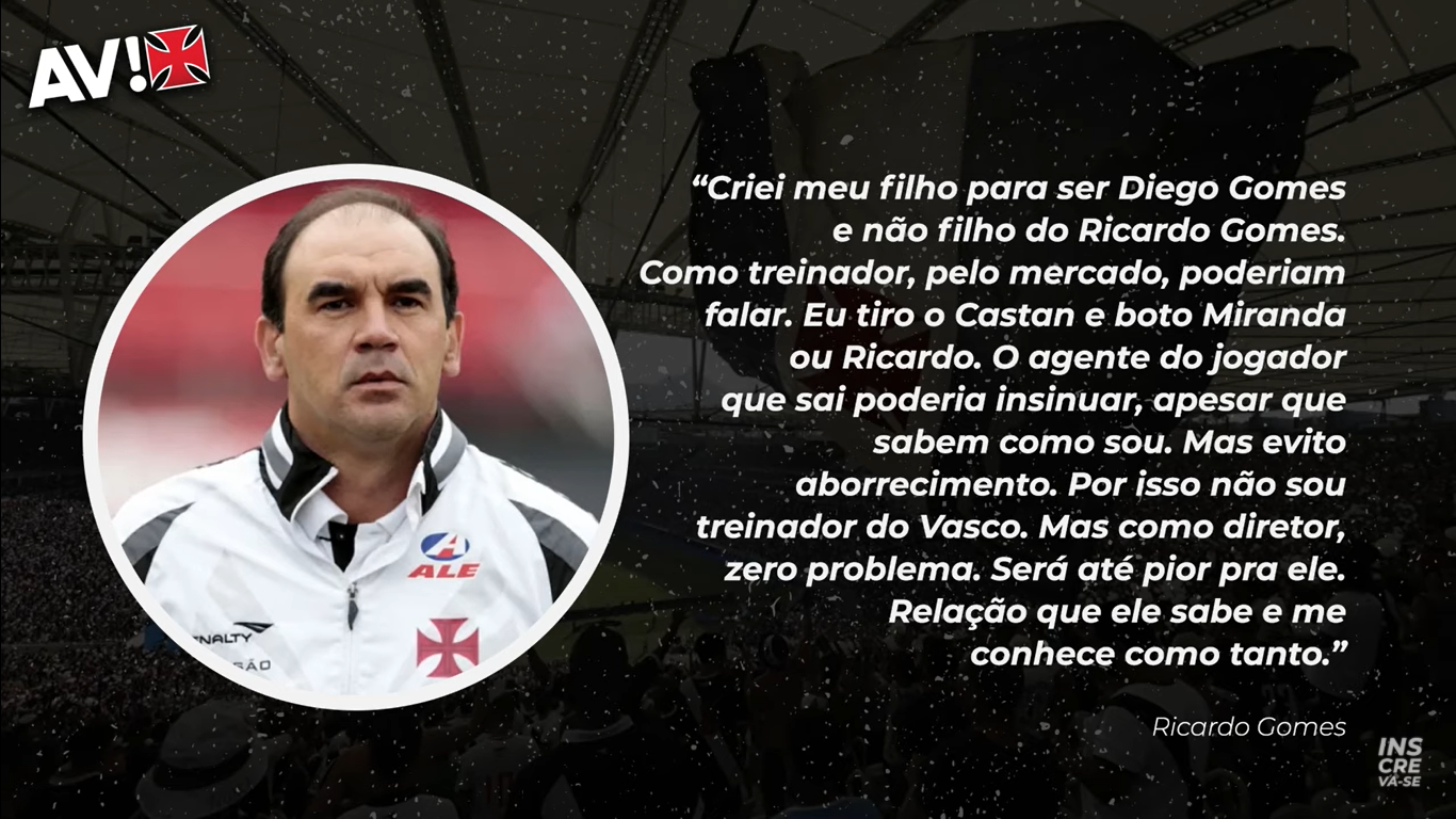 "Criei meu filho para ser Diego Gomes e não filho do Ricardo Gomes. Como treinador, pelo mercado, poderiam falar. Eu tiro o Castan e boto Miranda ou Ricardo. O agente do jogador que sai poderia insinuar, apesar que sabem como eu sou. Mas evito aborrecimento. Por isso não sou mais treinador do Vasco. Mas como diretor, zero problema. Será até pior pra ele. Relação que ele sabe e me conhece como tanto."