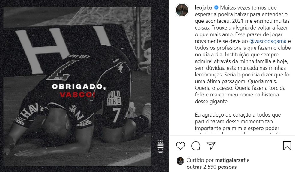 Muitas vezes temos que esperar a poeira baixar para entender o que aconteceu. 2021 me ensinou muitas coisas. Trouxe a alegria de voltar a fazer o que mais amo. Esse prazer de jogar novamente se deve ao @vascodagama e todos os profissionais que fazem o clube no dia a dia. Instituição que sempre admirei através da minha família e hoje, sem dúvidas, está marcada nas minhas lembranças. Seria hipocrisia dizer que foi uma ótima passagem. Queria mais. Queria o acesso. Queria fazer a torcida feliz e marcar meu nome na história desse gigante.