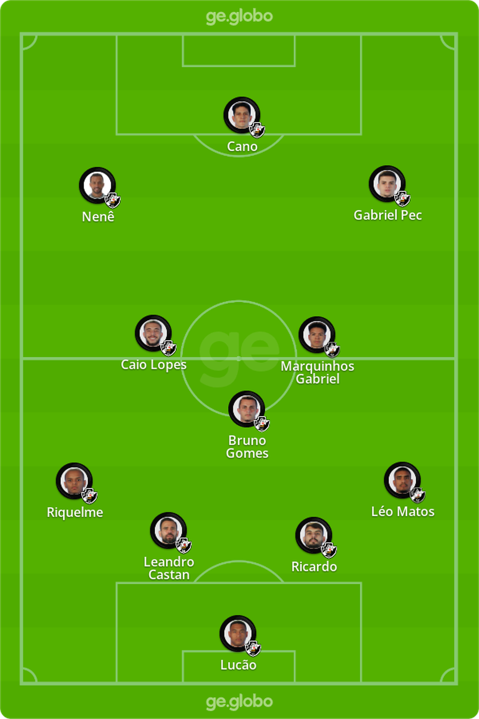 O provável Vasco é: Lucão; Léo Matos, Ricardo Graça, Leandro Castan e Riquelme; Bruno Gomes, Caio Lopes, Marquinhos Gabriel e Nenê, Gabriel Pec e Cano.