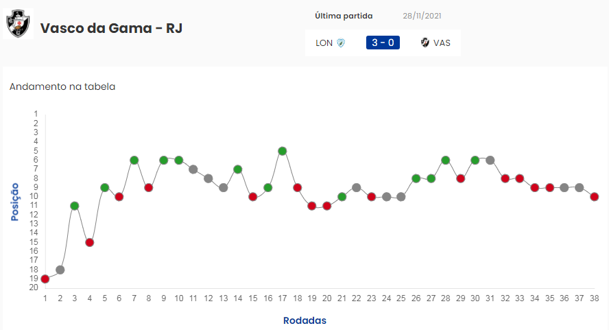 O gráfico final da campanha do Vasco nesta Série B. Melhor posição da equipe foi na 17ª rodada, na 5ª colocação. 38 rodadas sem sequer entrar no G4 da Série B por uma rodada que fosse. Segundo turno desastroso, com apenas 5 vitórias. #VascoENM