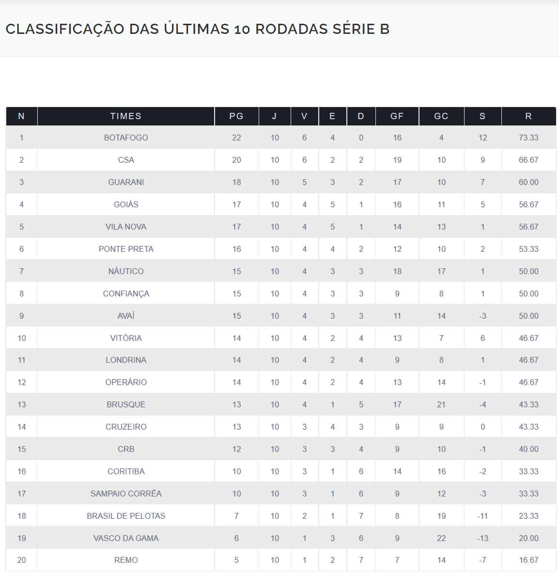 Décimo colocado na classificação geral do Brasileiro da Série B 2021, o Vasco teve a segunda pior campanha das últimas 10 rodadas da competição, com apenas 6 pontos ganhos em 10 jogos.