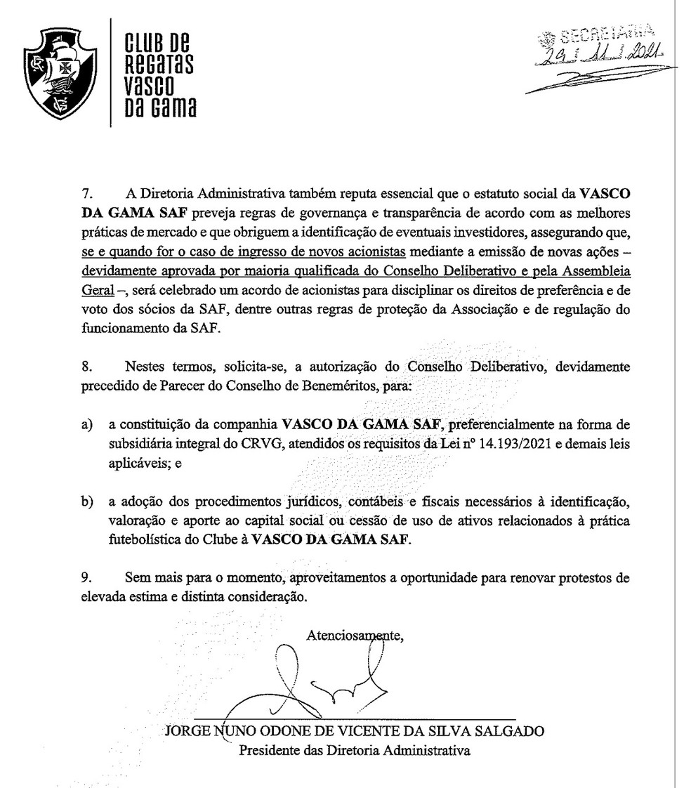 Após virada de posição em relação ao clube-empresa, a diretoria do Vasco, encabeçada pelo presidente Jorge Salgado, mandou carta a órgãos internos com o pedido para avançar na abertura de uma SAF (Sociedade Anônima do Futebol). É a primeira vez que há interesse nesse modelo.