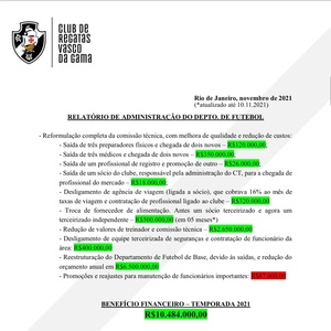 "(...) A segunda - e mais importante parte - que era o acesso à Série A fracassou e por isso faço meu sincero pedido de desculpas à torcida vascaína e a todos os envolvidos. Não há argumento, particularidade ou evento que justifique esse fracasso esportivo. Espero que, com a ajuda do caminho pavimentado no Departamento, o Vasco esteja na Série A de 2023".